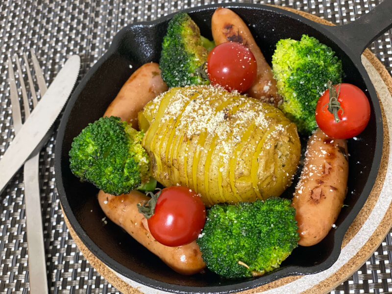 切り込みを入れたじゃがいもと一緒にお好みの具材をスキレットに入れて、そのままオーブンで焼くことができます。