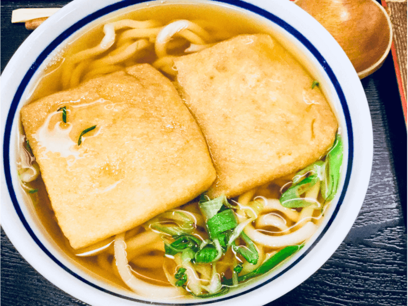 開業当初、うどんの付け合わせとして稲荷寿司用の甘辛く煮た揚げを別皿に出していましたが、そのままうどんの中に入れて食べる客が多かったため、うどんに入れて出し始めたのが、きつねうどんの始まりだと言われています。