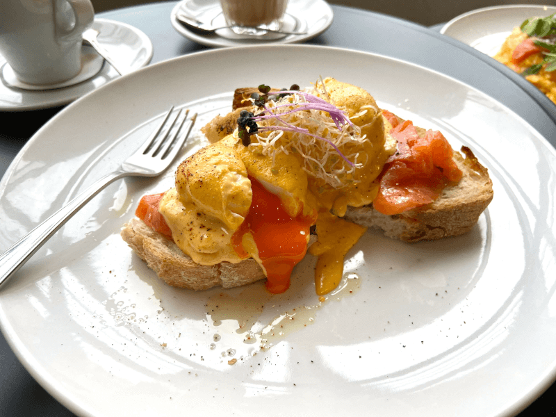ランチに人気のメニューで、オランデーズソースがかかった半熟卵が香ばしいライ麦パンと相性抜群なんです♪